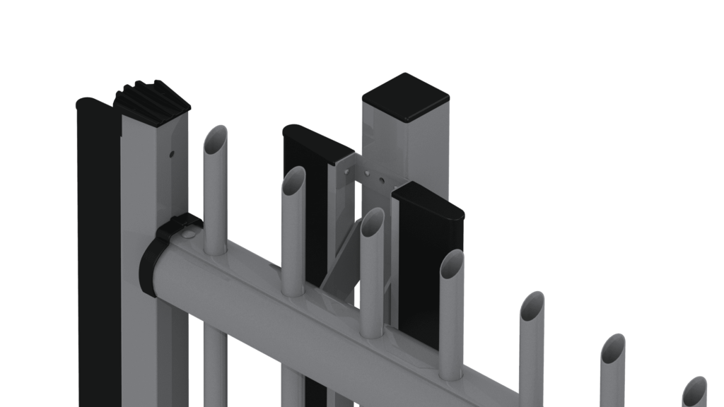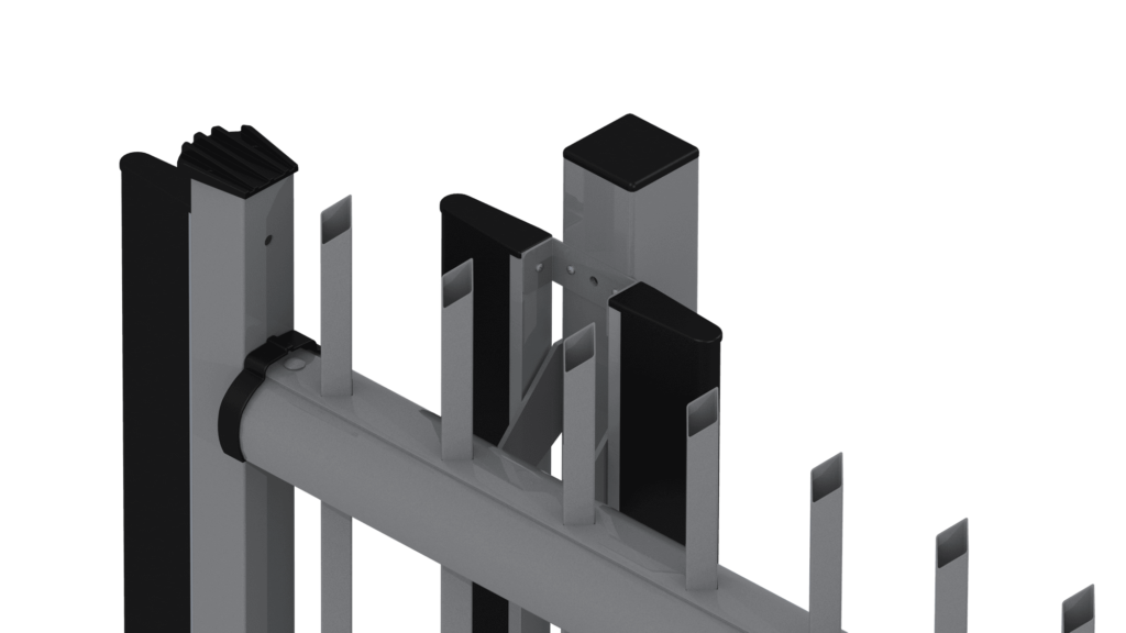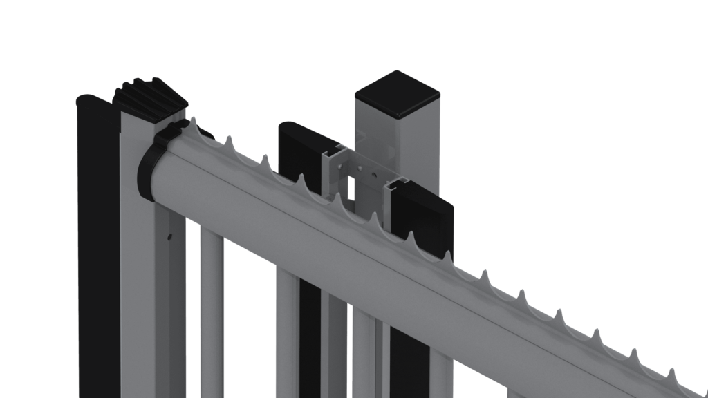 De Barricade-uitvoering van de Eco-Liner schuifpoort is uitgerust met ronde, aluminium spijlen tussen de liggers voor een moderne en stevige uitstraling. Voor een optimale beveiliging tegen overklimmen, wordt de schuifpoort bij een hoogte van minimaal 150 cm voorzien van een scherpe puntenkam.